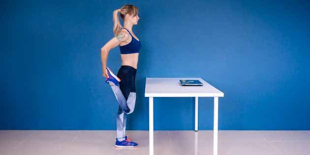- Maintenez la position pendant 30 à 60 secondes, en vous tenant à un mur ou au dossier d’une chaisesi vous craignez de perdre l’équilibre. Répétez l’exercice avec la jambe opposée.