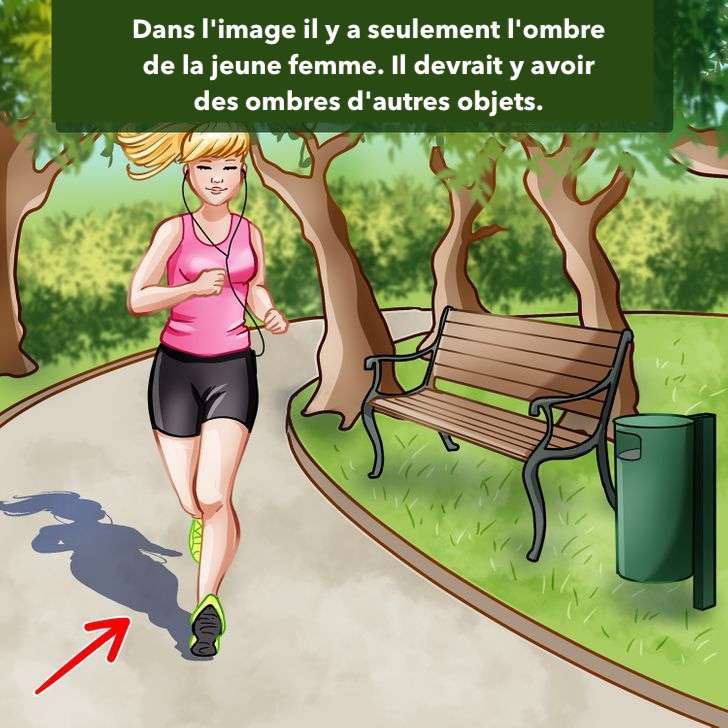 Revenons à notre joggeuse. Avez-vous scruté l’image avec attention ? Concentrons-nous sur un élément fréquemment oublié : le jeu des ombres. Sur la photographie, la sportive projette bel et bien son ombre, conformément à la logique d’une journée ensoleillée. Mais qu’en est-il des ombres des arbres ? Des bancs ? Des autres éléments du décor ? Particulier, n’est-ce pas ?