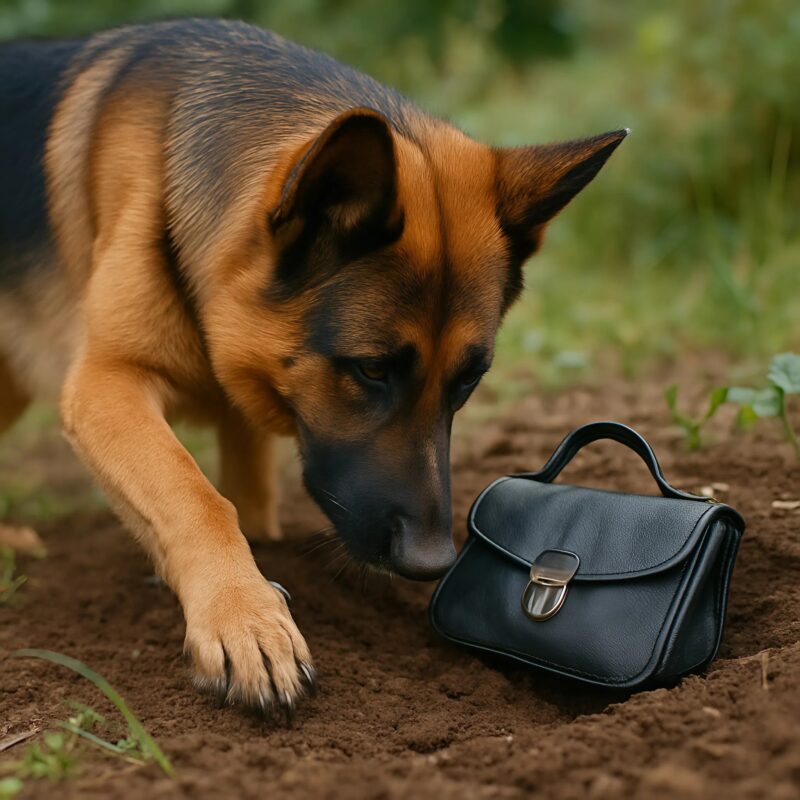 Soudain, son attitude changea complètement. Immobile, le museau rivé au sol, tout son corps exprimait une concentration intense. En m’approchant, je découvris l’objet de son attention : un sac en cuir sombre, partiellement enterré, qui semblait avoir été placé là intentionnellement.