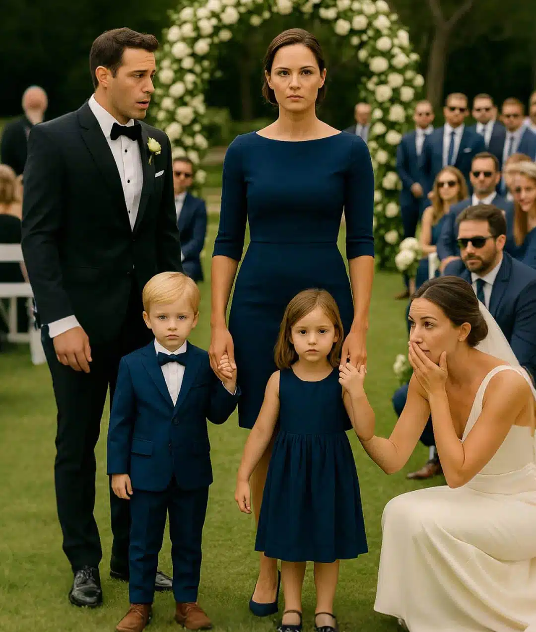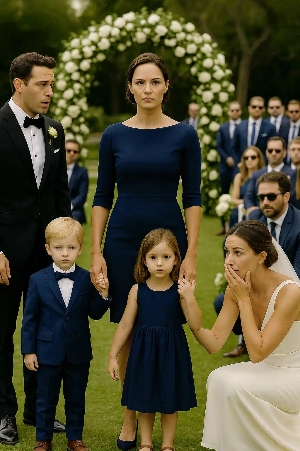 Soudain, il l’aperçut : Léa, vêtue d’une robe bleu marine d’une élégante simplicité, coiffée avec sobriété… et deux enfants à ses côtés. Un garçon et une fille, manifestement jumeaux.