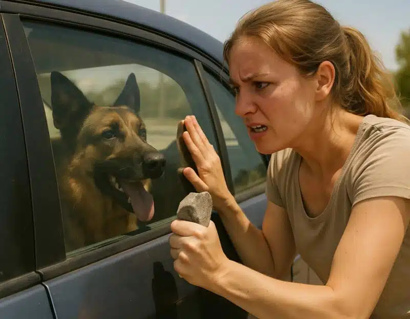 En marchant sur ce parking surchauffé, quelque chose a attiré mon regard. À l’intérieur d’une voiture aux vitres embuées par la température étouffante, un berger allemand était prisonnier. Son regard épuisé, sa respiration saccadée et sa langue pendante trahissaient une souffrance évidente.
