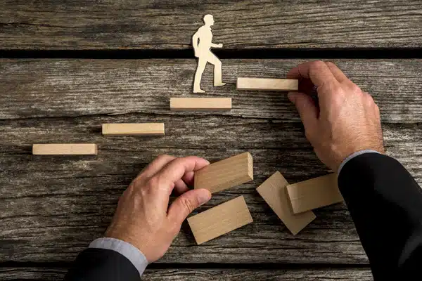 Silhouette cutouts of a man walking up steps, while the hand of other businessman building stairs for him in a conceptual image of personal and career promotion.