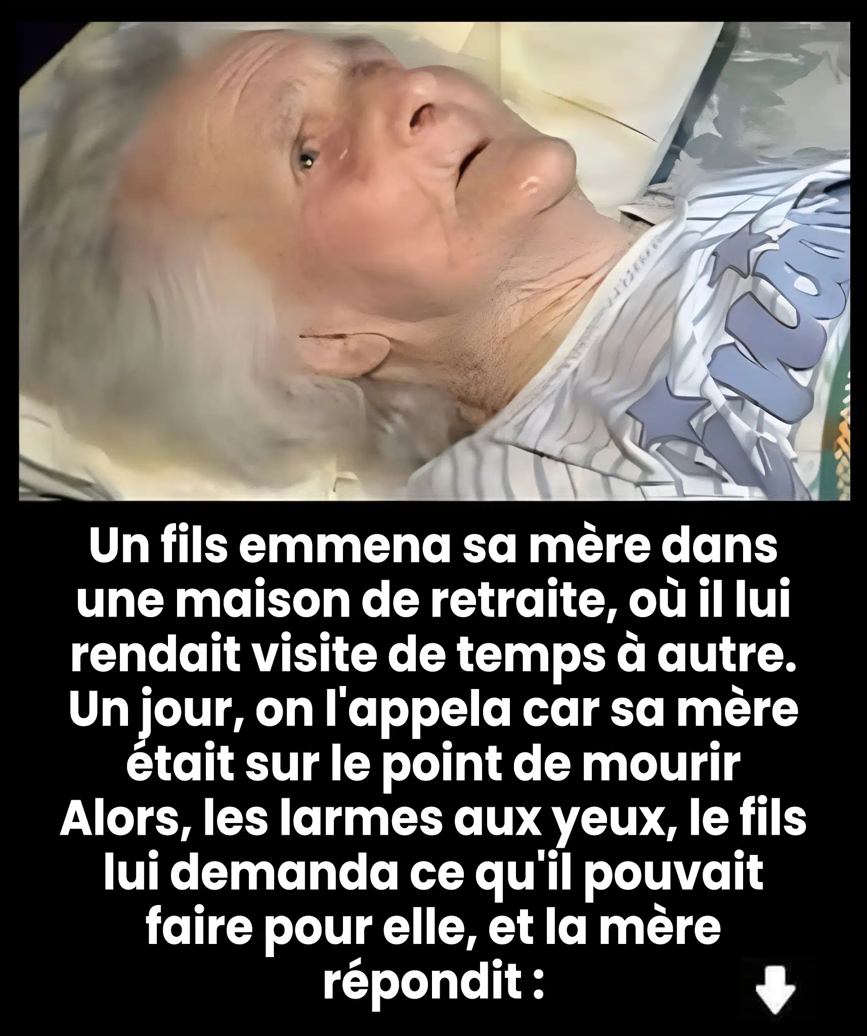 « Un fils emmena sa mère dans une maison de retraite, où il lui rendait visite de temps à autre. Un jour, on l’appela car sa mère était à l’article de la mort. Alors, les larmes aux yeux, le fils lui demanda ce qu’il pouvait faire pour elle, et la mère répondit : »