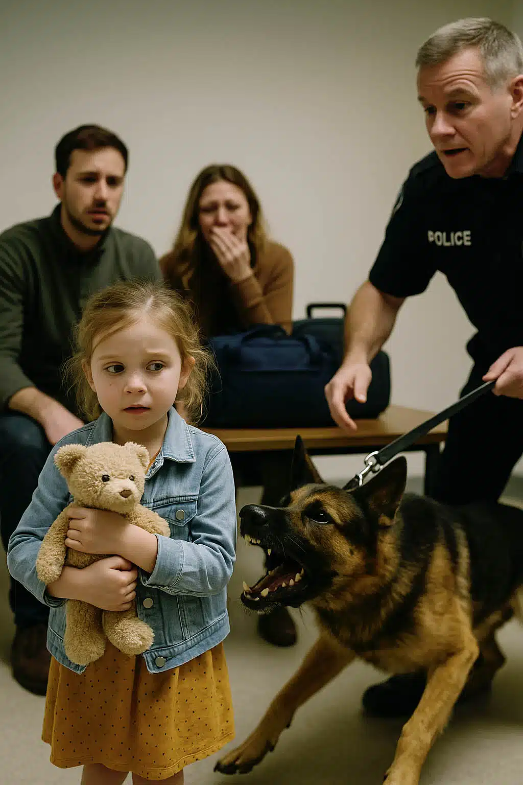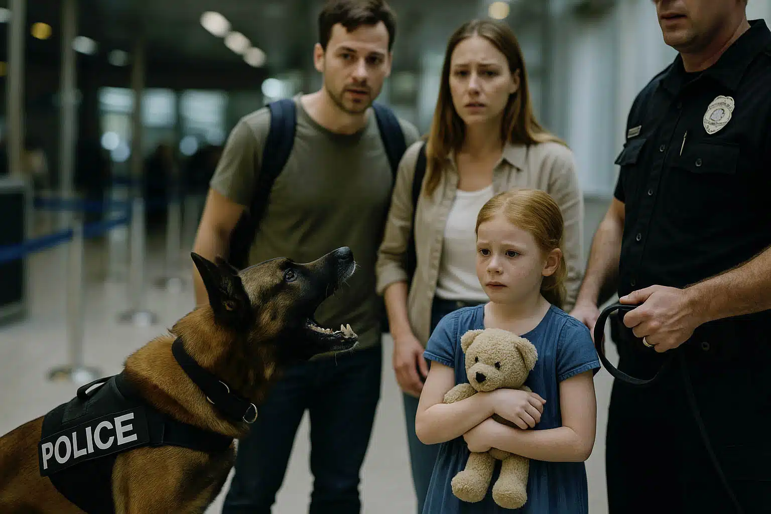 Sans perdre une seconde, l’agent Dubois s’approche de la famille. Avec tact, il leur explique que leur peluche a attiré l’attention du chien. Dans une salle à l’écart, sous le regard attentif des agents, l’ours est confié à Dubois.