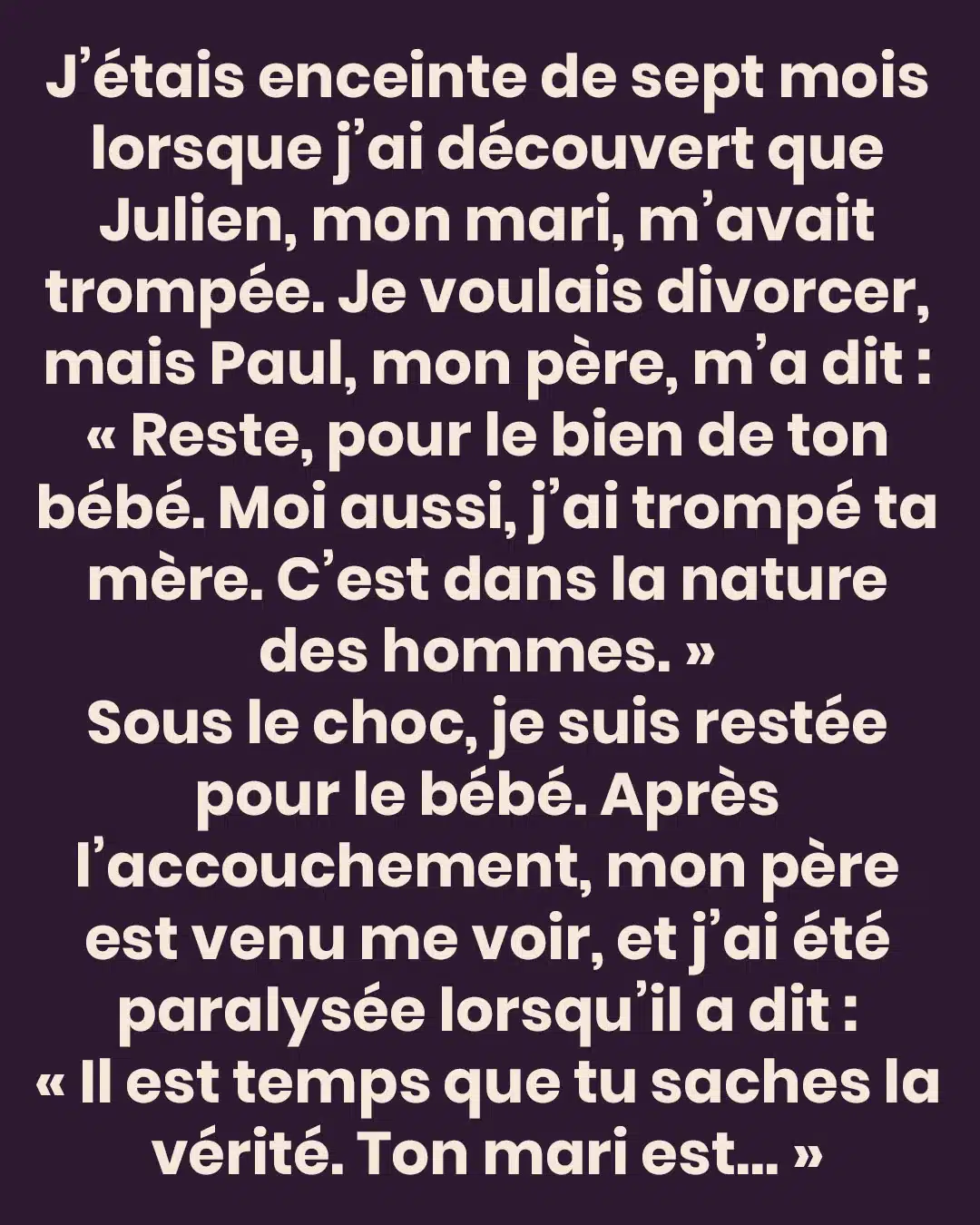 Quelques jours plus tard, à la maternité, mon père est revenu me voir. Son expression était différente, plus déterminée. Il a saisi ma main et m’a annoncé qu’il était temps que j’apprenne la vérité. Son aveu d’infidélité passée était un mensonge. Il avait inventé cette histoire uniquement pour m’éviter une décision lourde et douloureuse pendant ma grossesse.