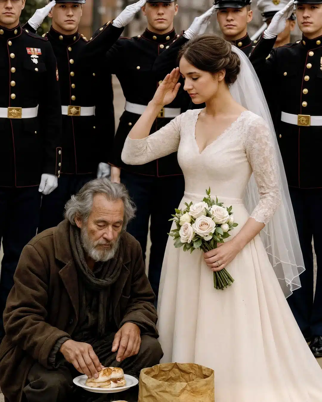 Le jour des noces, parmi la foule des invités, Émilie reconnut immédiatement l’homme au manteau usé… exceptionnellement habillé d’un élégant costume. Elle se précipita vers lui pour l’étreindre chaleureusement. À ce moment précis, douze hommes en uniforme firent leur entrée. Leur porte-parole prit la parole :