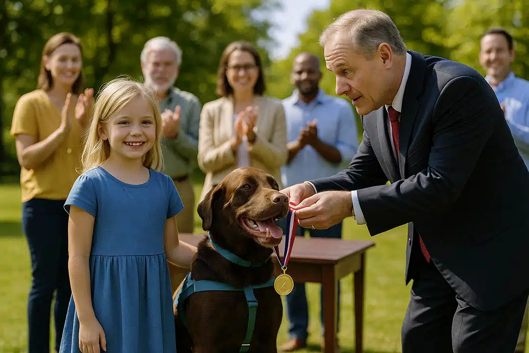 Trois semaines plus tard, le maire lui décerna la médaille municipale de fidélité et de courage, une distinction inédite pour un chien d’assistance dans notre commune. Emma, rayonnante, déclara face aux médias :