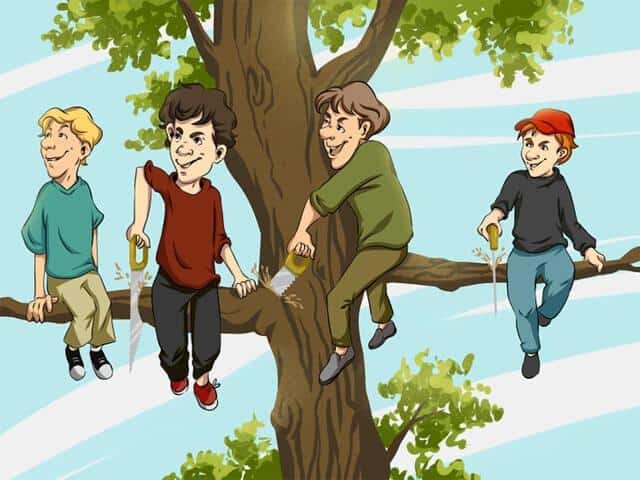 Si vous avez identifié le garçon au couvre-cheme rouge (numéro 4) comme celui qui commet la plus lourde faute, félicitations ! C’est bel et bien lui l’auteur de la méprise la plus patente. Il entame directement la branche qui le soutient, ce qui le voue inéluctablement à la chute.