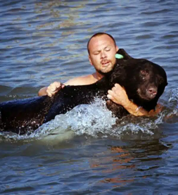 Miraculeusement, l’ours ne oppose aucune résistance. On dirait presque qu’il perçoit l’intention bienveillante de son sauveur.