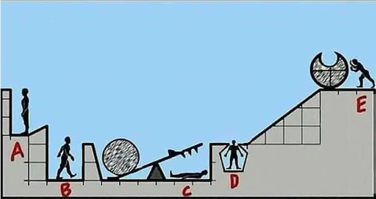 Voici le setup : E s’apprête à faire rouler un rocher qui pourrait dévaler une inclinaison. En contrebas, D est prisonnier, seule sa tête émerge. À proximité, une planche pivotante supporte un autre rocher d’un côté ; sous l’autre extrémité surélevée, C est allongé. Non loin, B et A regardent. Le piège ? Ne pas se laisser distraire par l’arrière-plan et se focaliser sur l’axe de descente, le point d’équilibre de la planche et la dynamique probable des pierres.