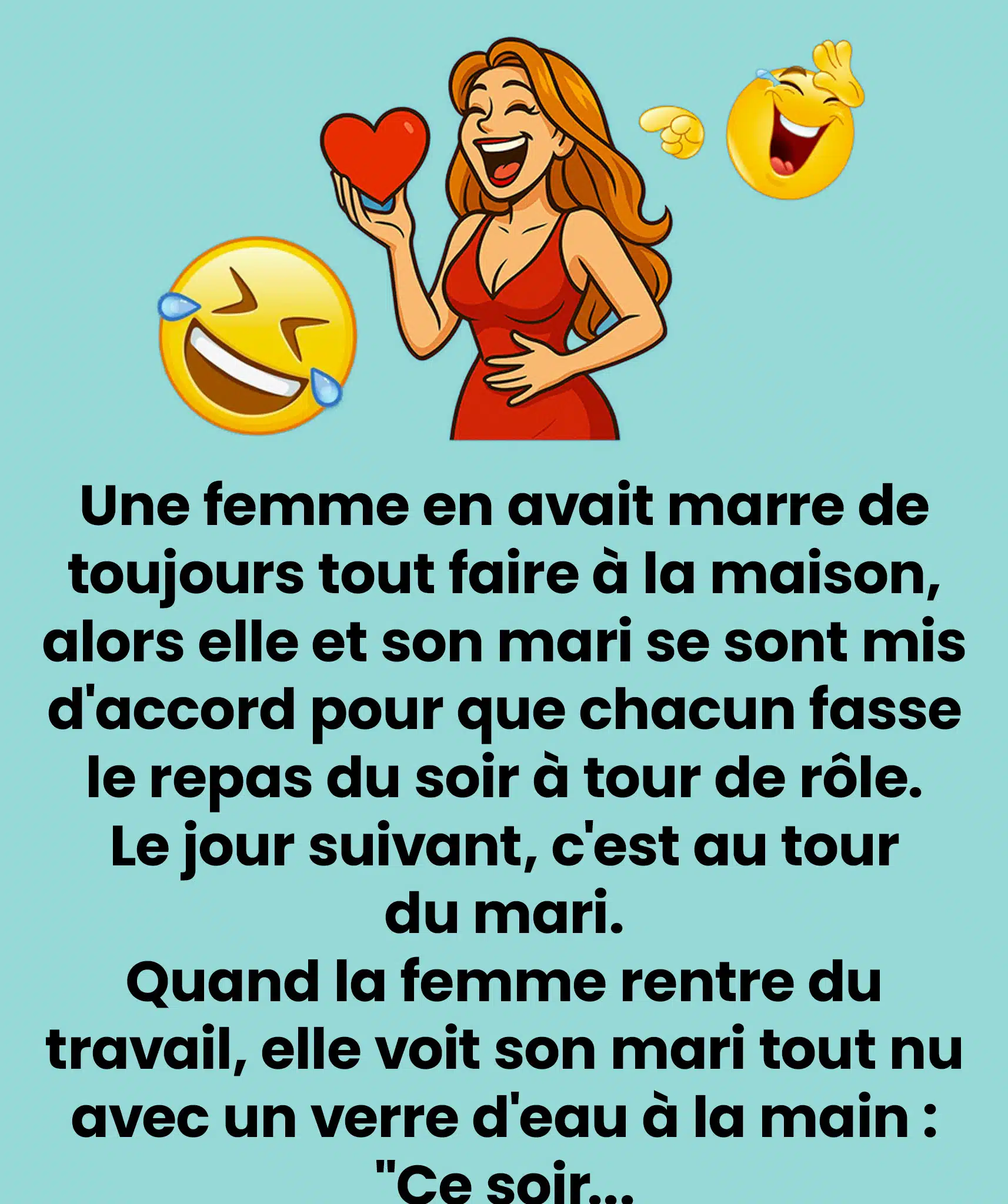 Un homme, convaincu de l’infidélité de son épouse, rentre plus tôt que prévu. En approchant de chez lui, il remarque un véhicule inconnu stationné devant sa maison. Sans réfléchir, il saisit… le réfrigérateur entier et le projette sur l’automobile ! (Mauvaise initiative, évidemment.) On le retrouve ensuite devant les portes du paradis, confronté à Saint Pierre. Peu après, un deuxième homme apparaît, suivi d’un troisième qui s’exclame : « Je ne saisis pas ce qui m’arrive… j’étais tranquillement dans mon frigo, quand soudain… »