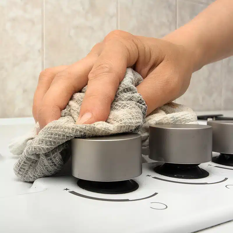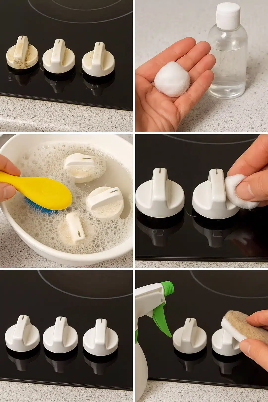 Dans un vaporisateur, mélangez de l’eau et un peu de vinaigre blanc. Pulvérisez sur les boutons, laissez poser quelques instants, puis frottez doucement avec une éponge. Ajoutez ensuite une pincée de bicarbonate sur l’éponge : la légère effervescence aide à décoller les traces persistantes.