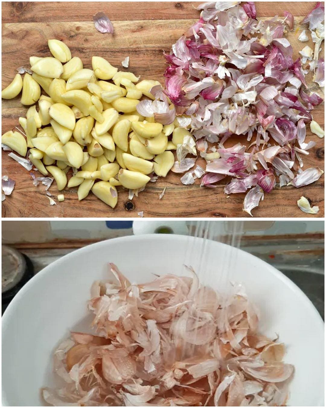 - Rassemblez les pelures d’environ quatre têtes d’ail (soit une bonne poignée).