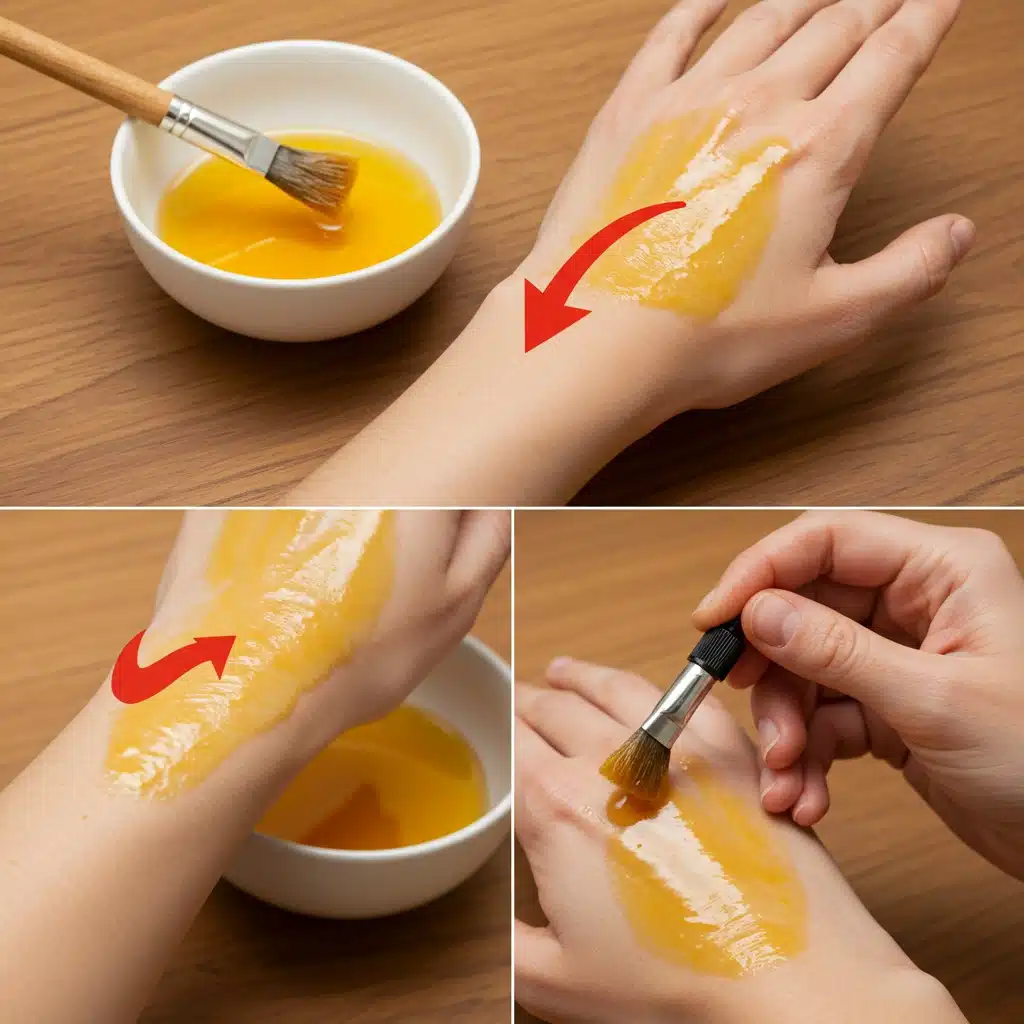 - Étalez le masque tiède uniformément sur le dos de vos mains à l’aide d’un pinceau cosmétique.