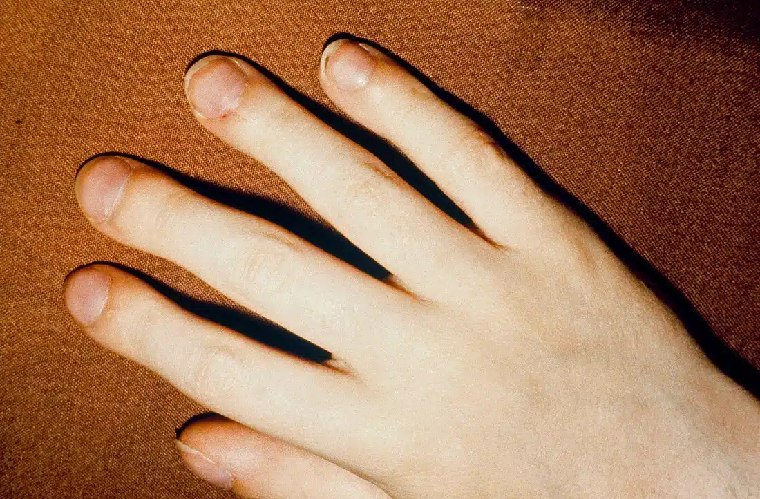 - Une teinte anormale : des ongles très pâles ou tirant sur le bleu peuvent indiquer une mauvaise oxygénation du sang.