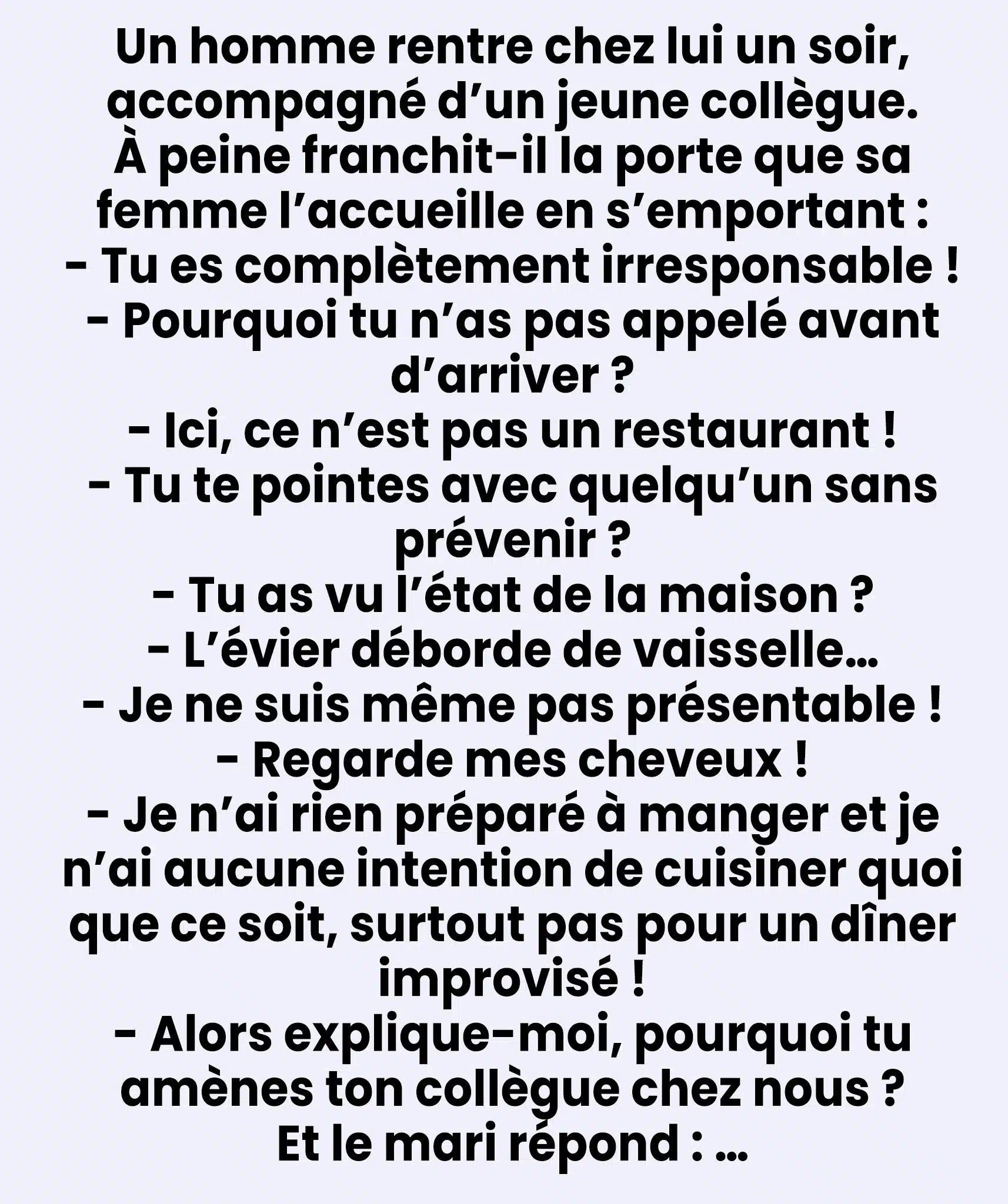 Lui : « La même chose que toi… je me précipiterais aussi chez ta sœur ! »